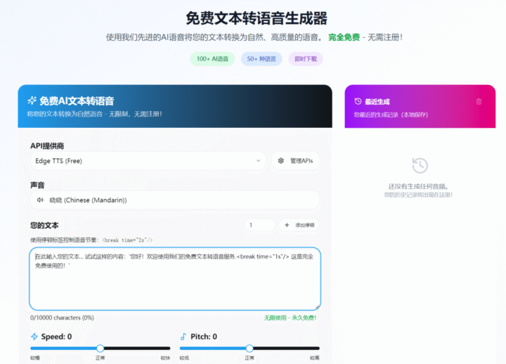 虽然不用登录,但它会 在浏览器本地保存你最近的生成记录!刷新页面也不会丢(只要不清缓存)。这意味着我可以快速回看上次用的文本和声音设置,特别适合反复修改脚本的场景。