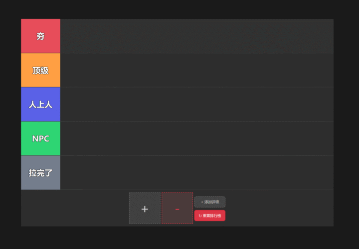 进入 从夯到拉排行榜生成网站,页面干净得像一张白纸——顶部是“夯”“顶级”“人上人”“NPC”“拉”五个默认层级,中间大片区域写着“拖放内容到这里”。没有广告、没有弹窗、更不用注册,连新手教程都省了——因为真的太直观了!